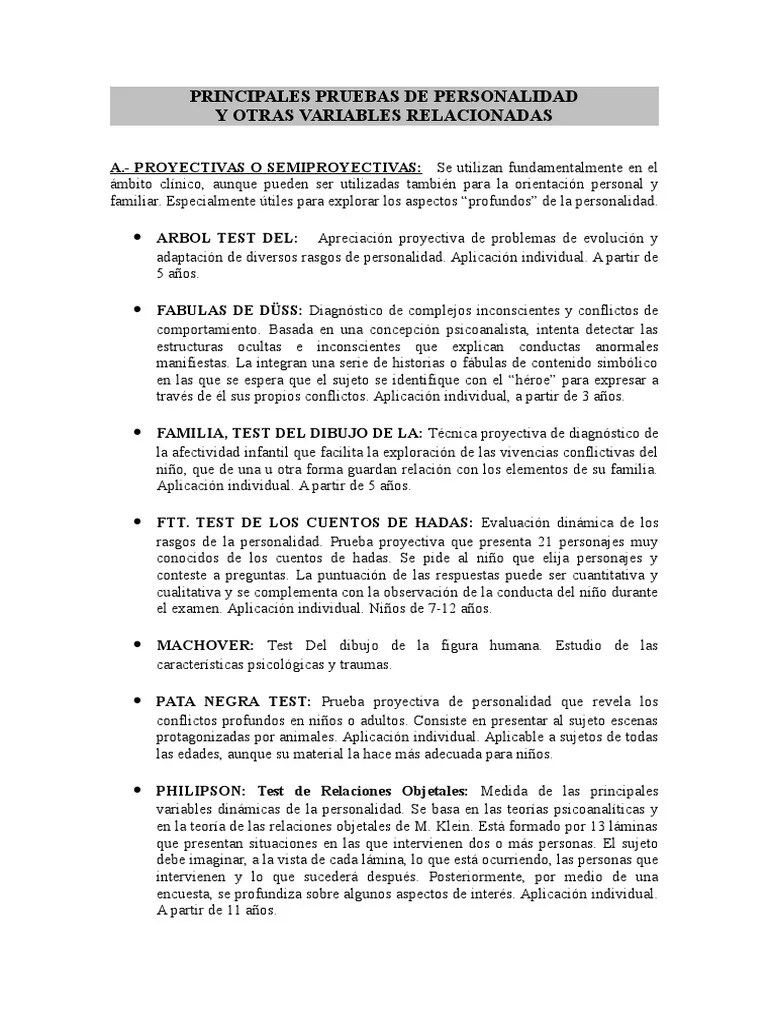 Listado de pruebas y test psicológicos disponibles en caps. Prueba proyectiva de personalidad que revela los conflictos profundos en niños o adultos. Está basado en la teoría de la personalidad de los cinco grandes y es el test de .